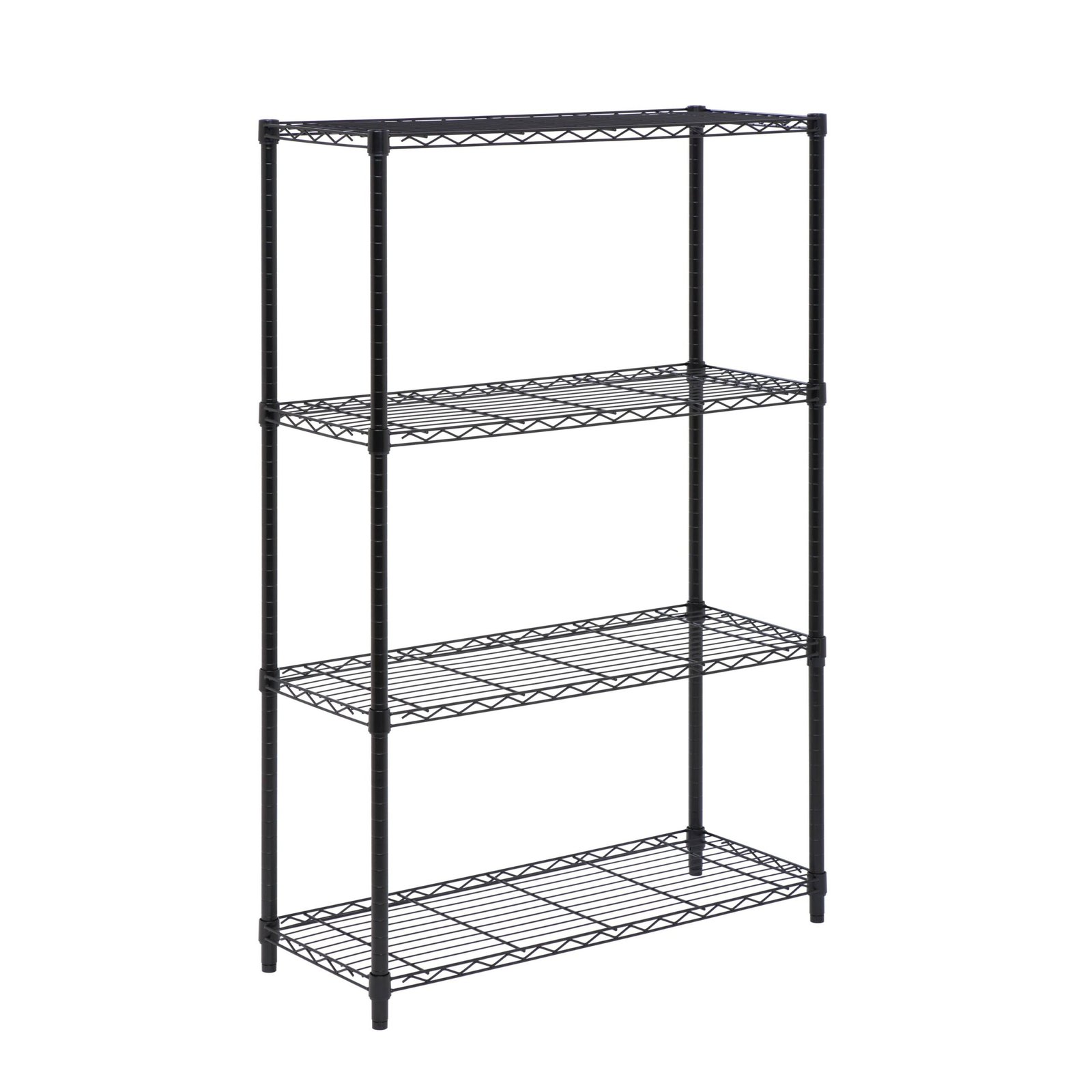 You love the versatility of shelving, if your shelving is versatile, that is. Well, it most certainly is with the heavy-duty 4-Tier Shelving Unit in Black. Maximize storage in any room of the house with this durable unit that can hold up to 350 pounds per shelf. Adjustable shelving heights is convenient for when shelving needs change or oddly-sized items arrive, like the large aqua deer statue that he just “had to have” from his last guys’ trip… hint, it’s going in the garage Commercial-grade certification makes this the perfect kitchen, garage or closet shelving unit. Your shelving needs to keep up with you – we make sure it does.