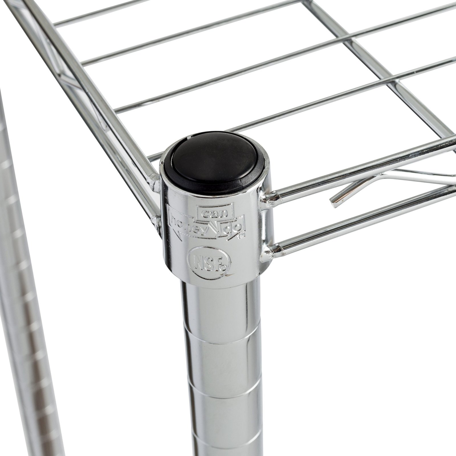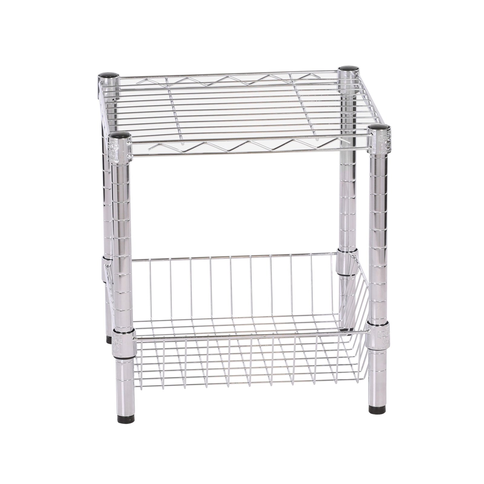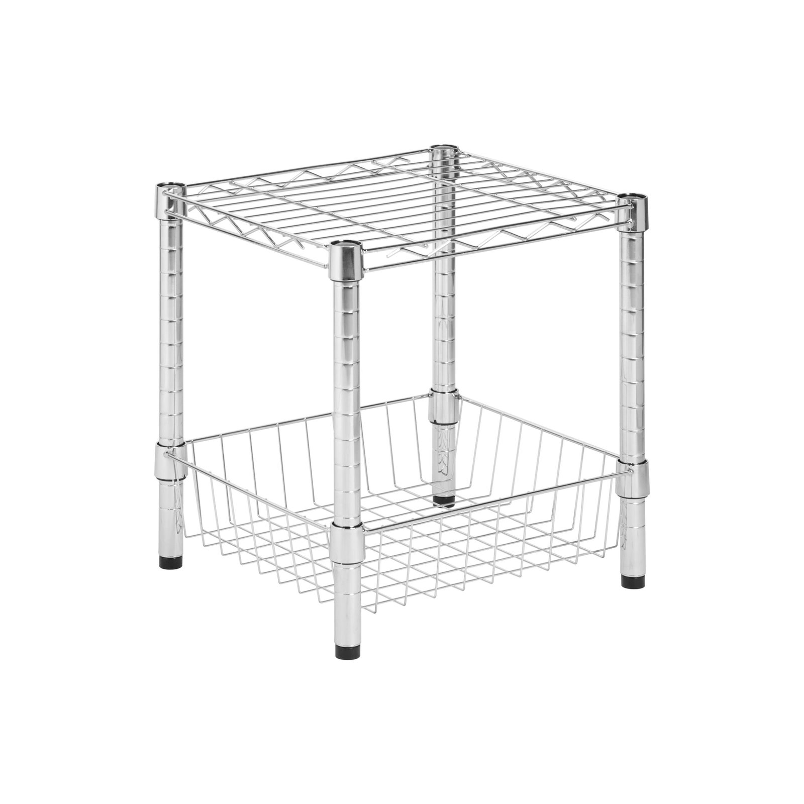 Create visible, accessible storage space instantly with this versatile shelf. Brilliant chrome finish and contemporary design makes this unit the perfect blend of good looks and functionality. Its sturdy, commercial quality frame has a grid-style thick wire top and handy lower storage basket that gets you organized. Store books, cds, towels, or anything you’d like to keep accessible. It is simple to assemble and knocks down to store or move easily. Stackable by design, this modular unit can be combined with other pieces in the line for a customized storage solution.