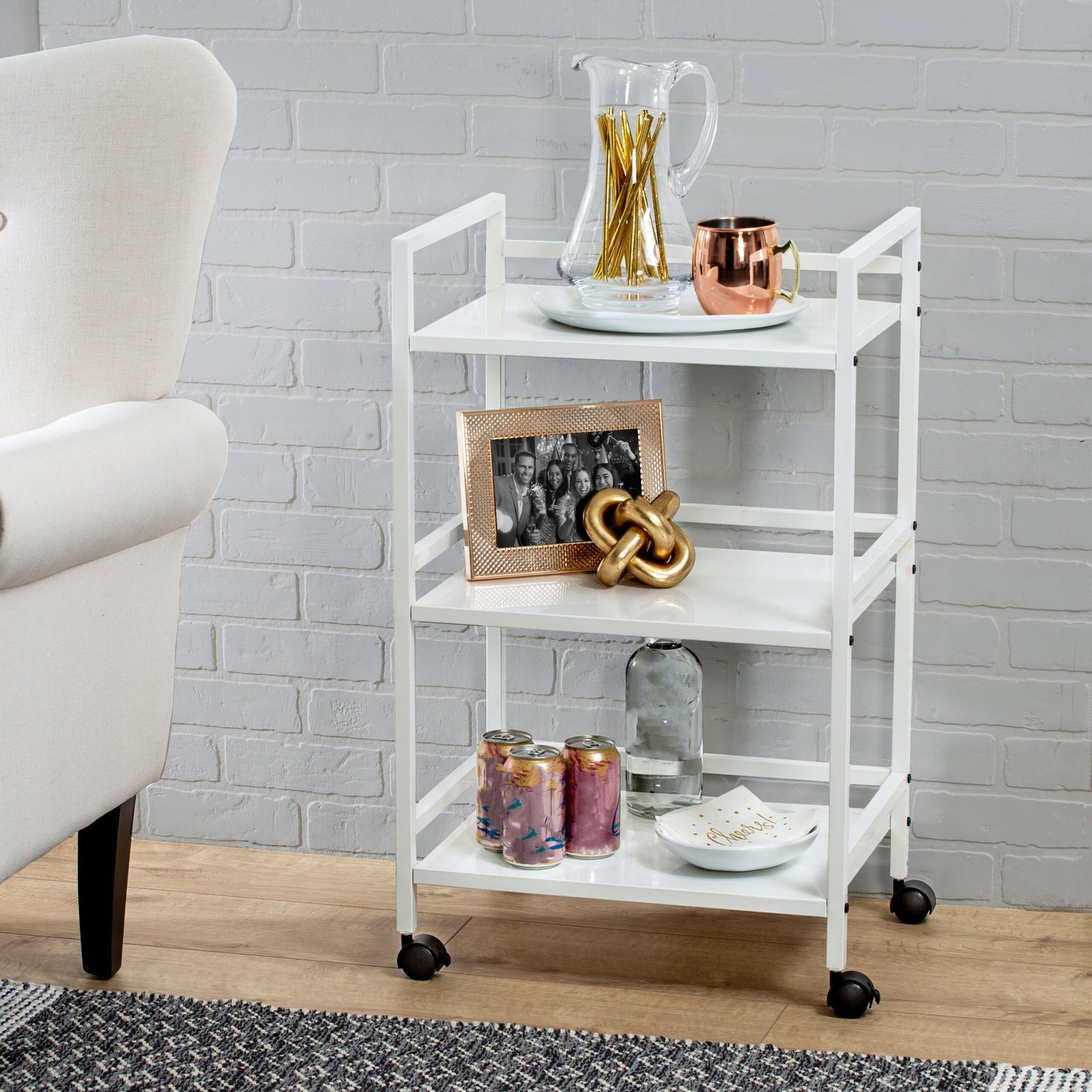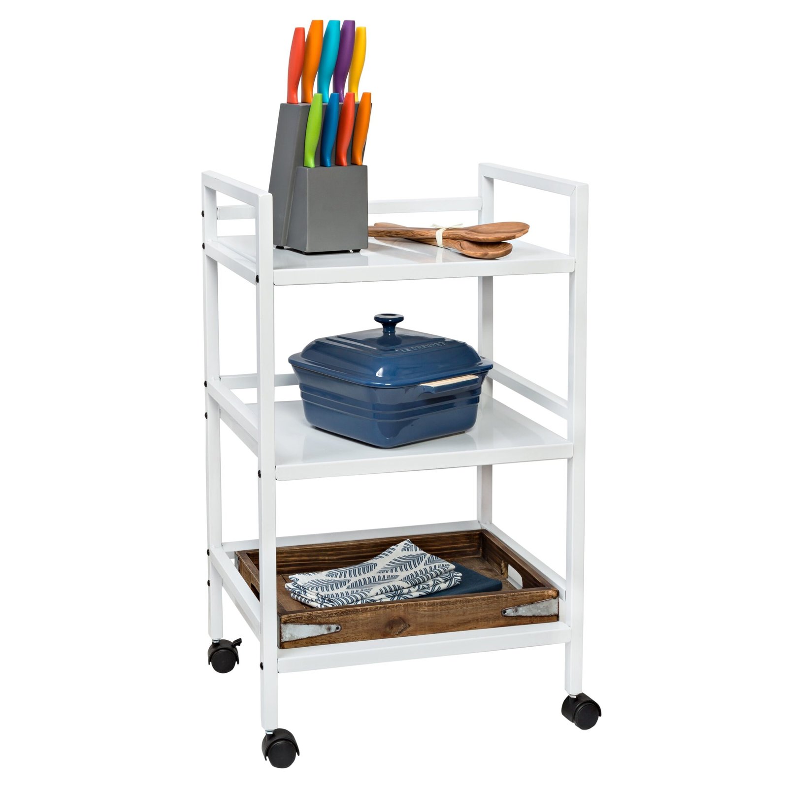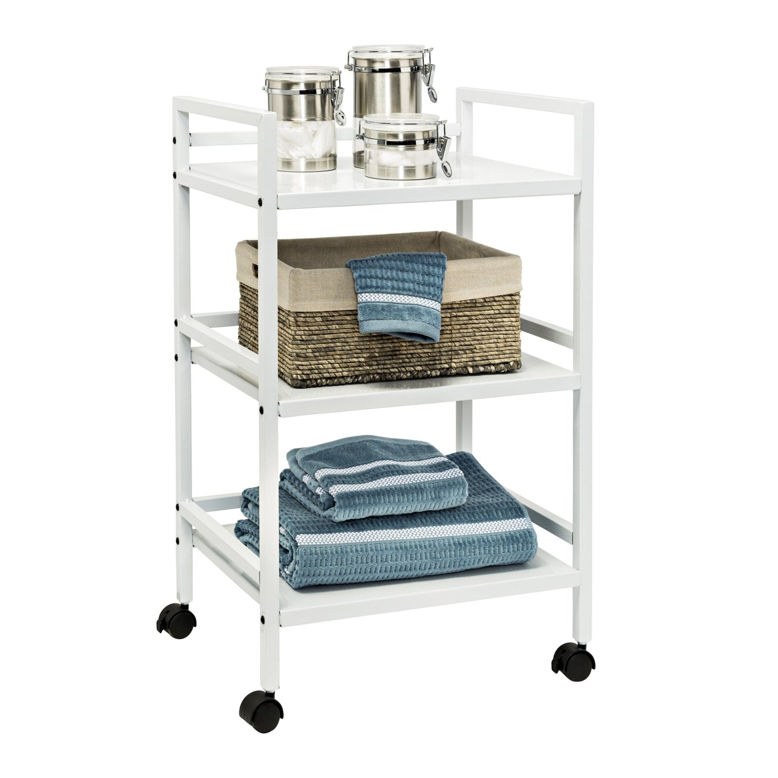 Easy to transport with plenty of storage space, this white 3-Tier Metal Rolling Cart will allow you to transfer your items from room to room with ease. Features four casters for smooth mobility, with two that lock to secure the cart in place when necessary. Ideal for bath, home office or kitchen storage.